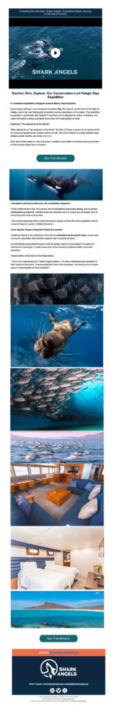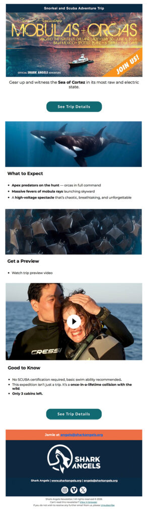 Shark Angels is a nonprofit dedicated to transforming fear of sharks into fascination and turning that fascination into meaningful ocean action. Through curated scuba and snorkel expeditions, they give ocean lovers the rare opportunity to encounter sharks in their natural environment and experience firsthand the beauty, power, and importance of these misunderstood animals.